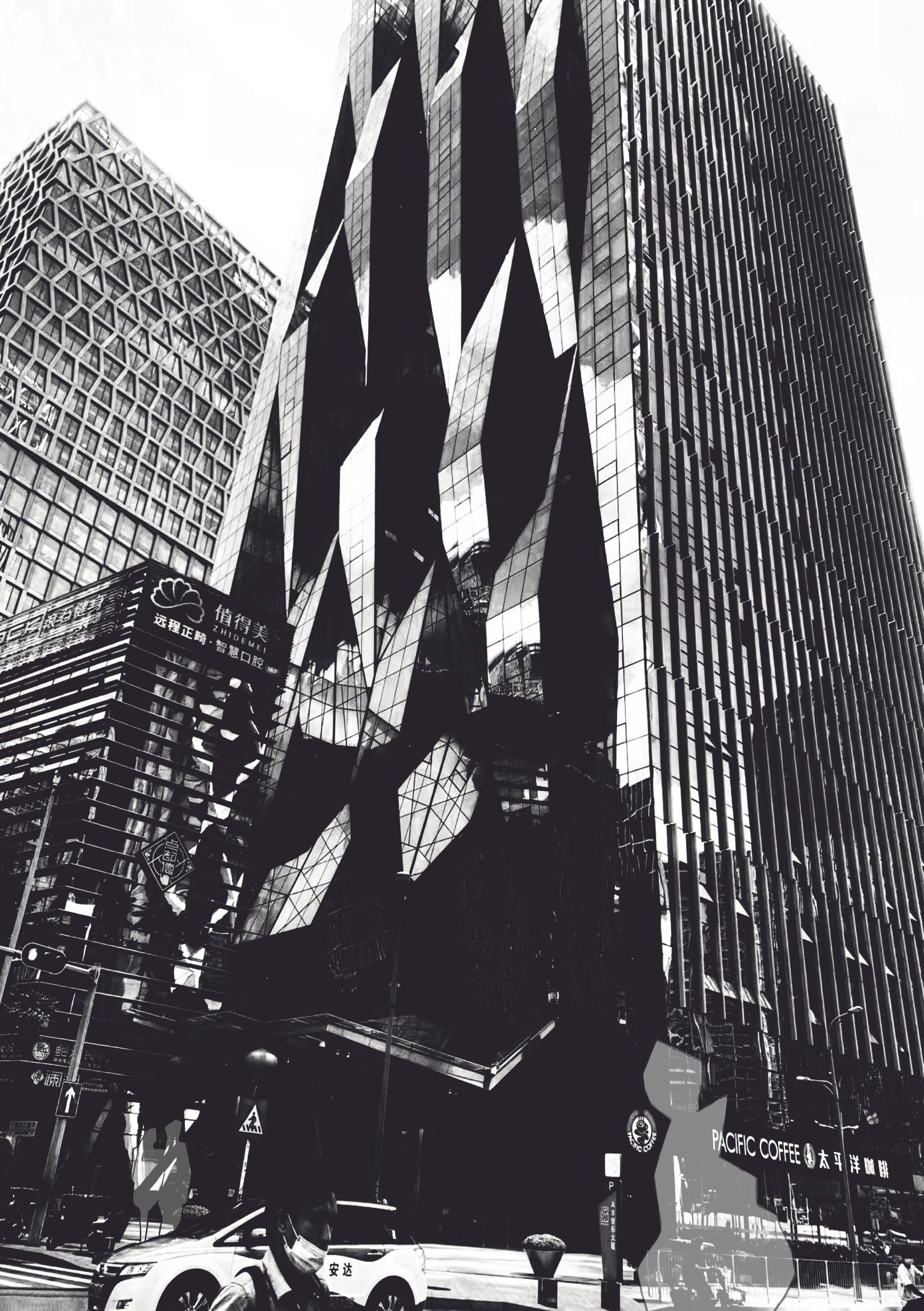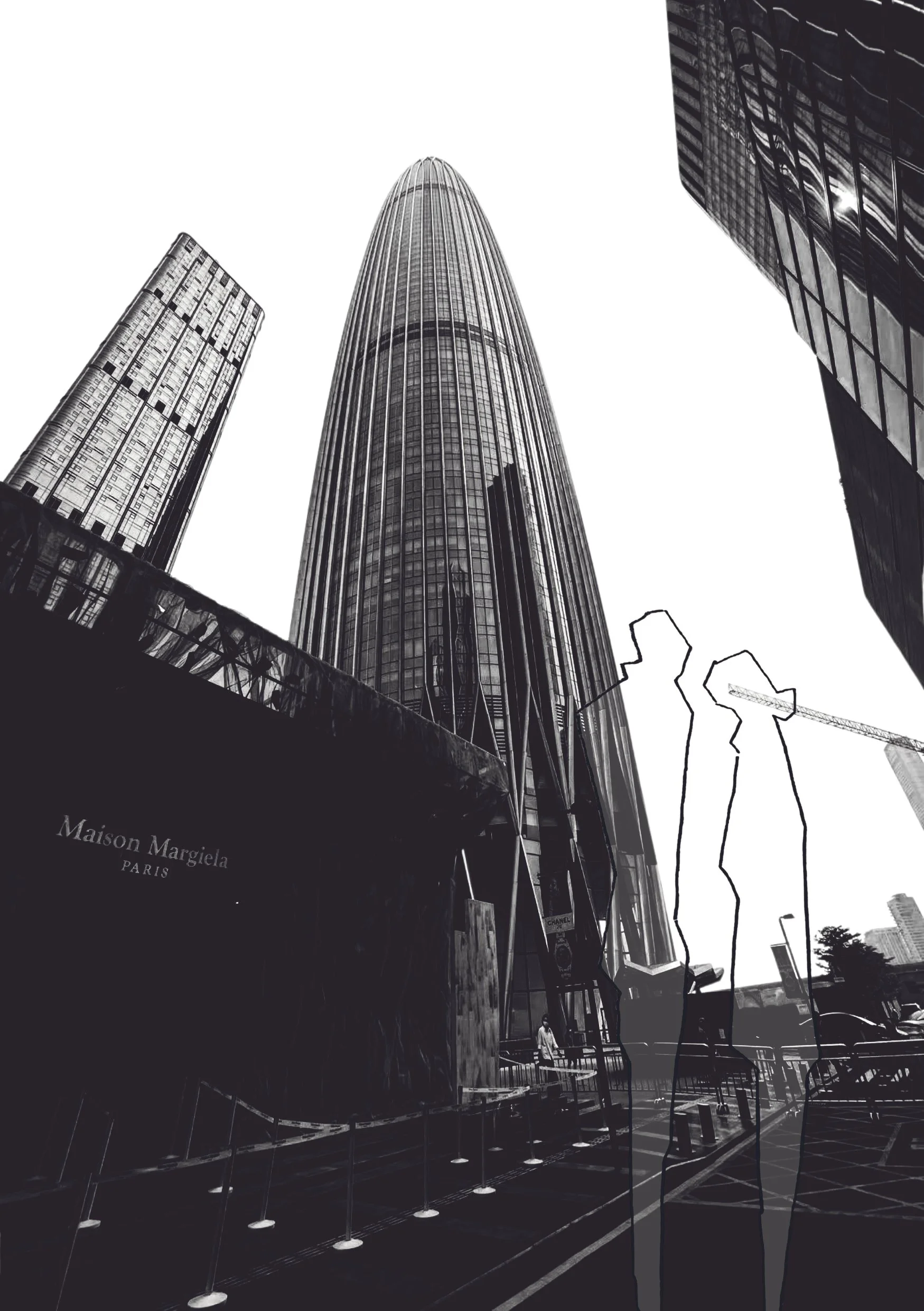 An experimental series of prints combining urban landscape photography with abstract figurative drawings in preparation for UV-sensitive polymer-based etches.